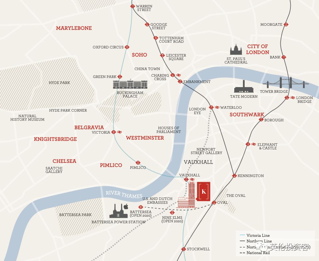 • 坐落于绿荫环绕的伦敦西南一区Vauxhall,与相邻的Nine Elms及Battersea区块组成了市中心最大的升级重建区域。步行数分钟即可抵达伦敦眼、大本钟和泰特美术馆等著名地标,乘坐地铁由Vauxhall站3分钟可达维多利亚,7分钟到达牛津街。坐拥丰富的教育资源配套,包括10所公立中小学和9所私立学校。