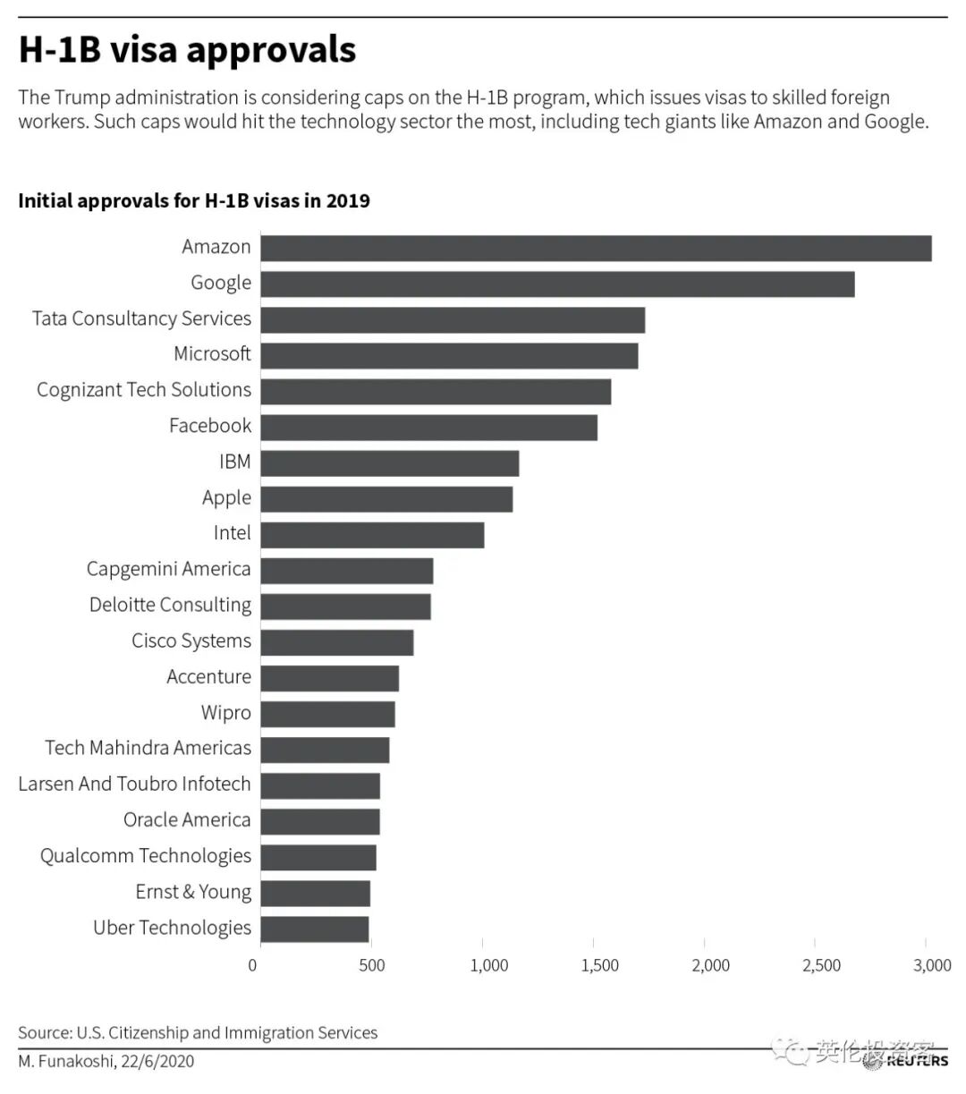 其中,亚马逊在2019年获得了3000份H-1B签证申请批准,而谷歌和苹果分别获得了超过2500份和1000份的签证申请批准。