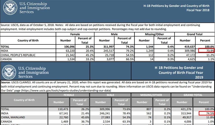根据统计,在签证持有者中,278,491人约占72%来自印度,而第二大H-1B签证持有者来自中国,持有50,609个签证,占13%。
