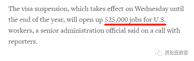 简单来说,特朗普认为,疫情导致美国人失业率飙升,因此把美国本土工作优先让给美国人。