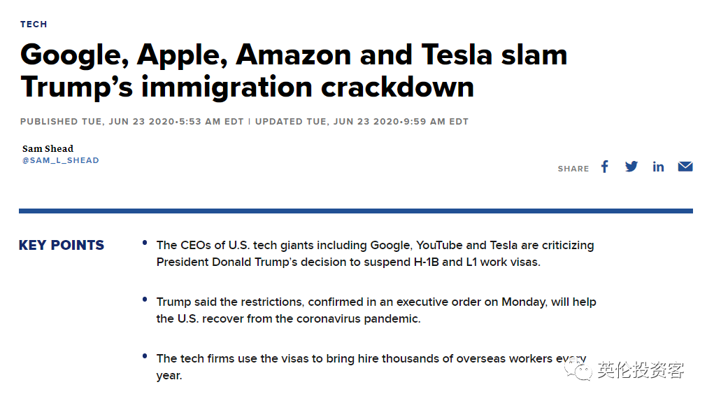 其他科技公司也发布公开声明称,特朗普借助疫情爆发限制移民,但却会破坏美国的文化多样性,影响到短期经济恢复甚至是更长期的竞争力。