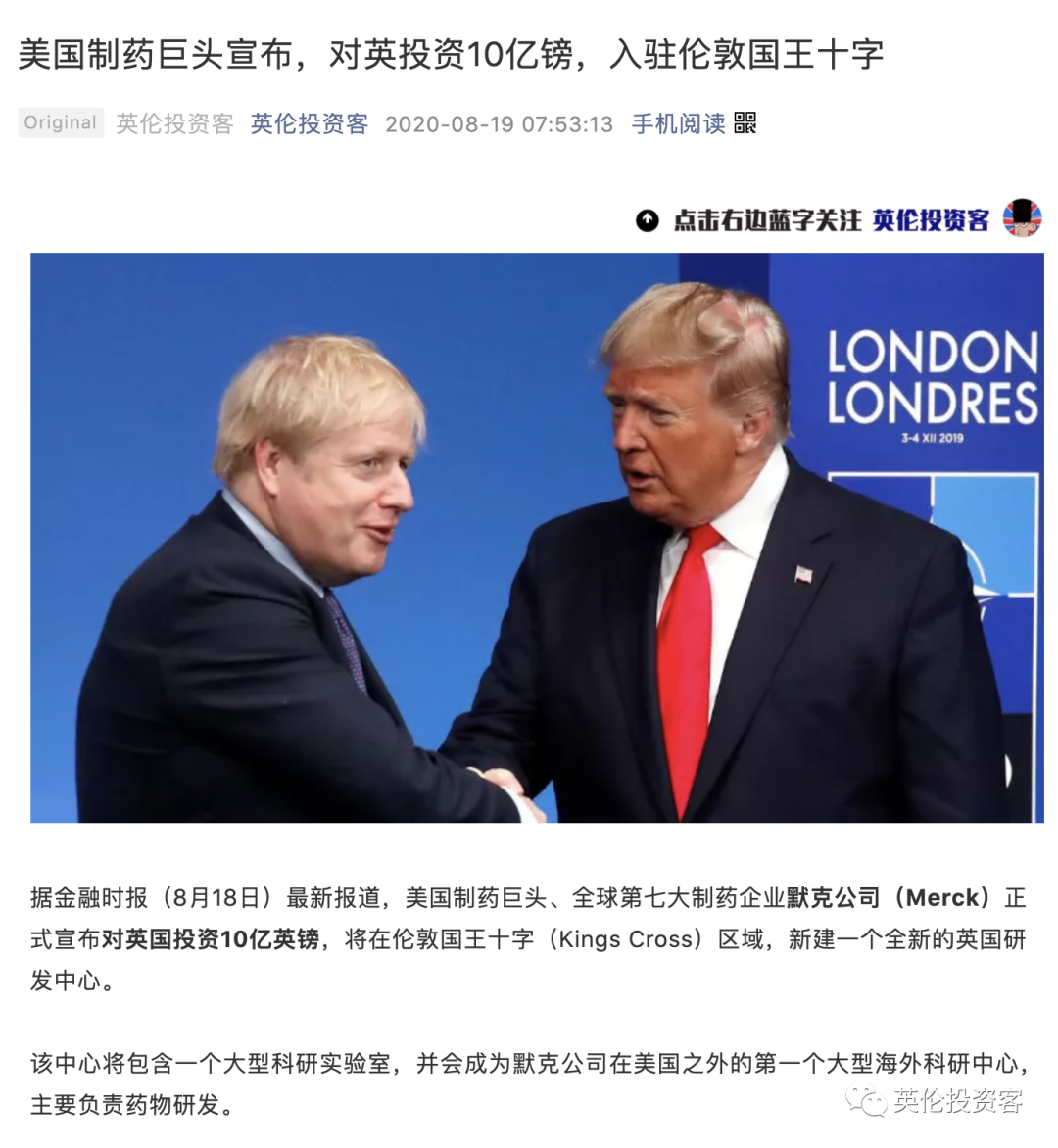 2020年8月18日,美国制药巨头默克公司宣布对国王十字投资10亿英镑,新建英国研发中心。