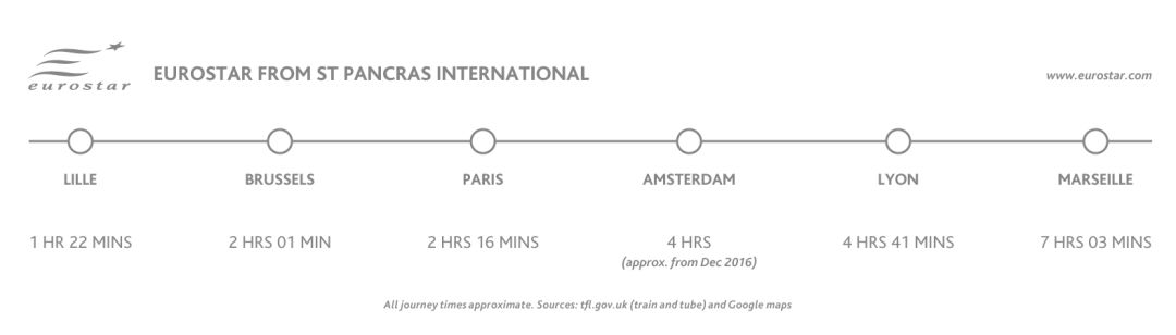在国王十字换乘欧洲之星,还能方便到达欧洲几大重要城市: