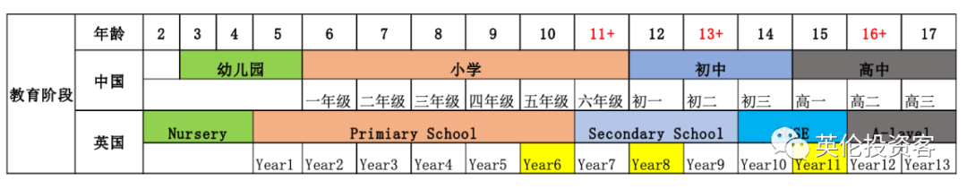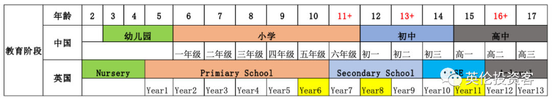 说到这里,不得不说一下英国的学制:英国中学大量入学的年龄是在11+和13+,到16+部分学校会有少量名额,有的名校可能都没有名额。所有的申请都至少要提前一年注册(下图黄色为对应各申请时的年级),然后通过学校考试和面试,最后拿到offer。