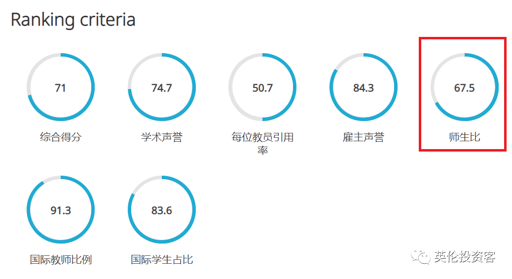 3)师生比(Faculty/Student Ratio)20%一所大学的教学质量是很难衡量的,QS认为师生比是衡量大学教学水平最好的替代方法。师生比例越高,学生获得的关注度可能就越高。![]()