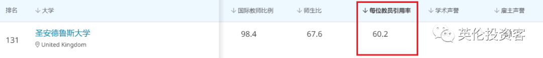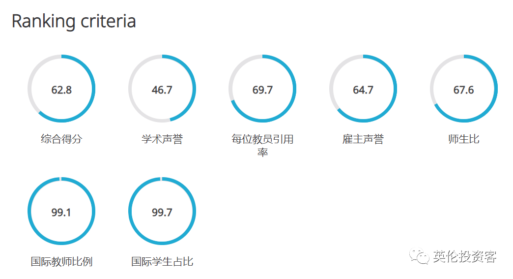 下图是圣安德鲁斯大学6项指标得分情况。可以看到,在其他指标变化不大的情况下,该校今年的人均文献引用率为69.7/100。![]()