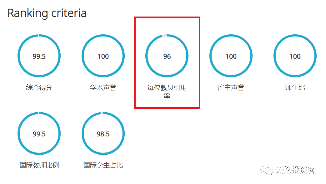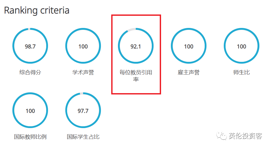 4)人均文献引用率(Citations per faculty)20%考察学校的科研水平。通过将五年内发表的所有论文被引用的总数与该大学的教员人数相比较进行衡量。