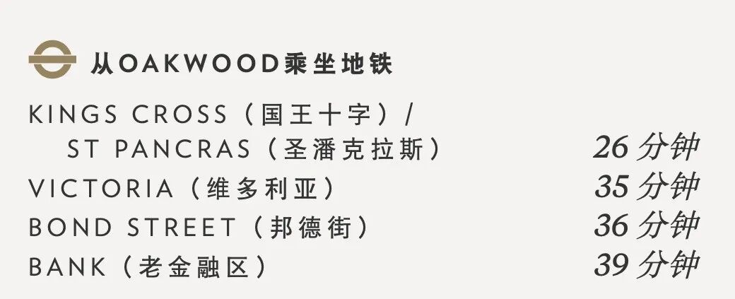 从距离项目最近的Oakwood地铁站出发,26分钟可到达UAL中央圣马丁艺术和设计学院。