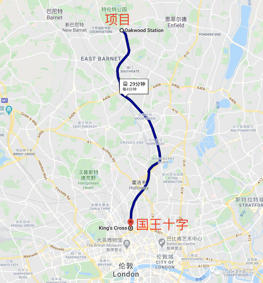 从Oakwood Station地铁站出发,搭乘地铁Picaddilly Line,29分钟可到达谷歌总部所在的国王十字,34分钟可以到达伦敦大学学院(UCL),40分钟到达伦敦金融城。