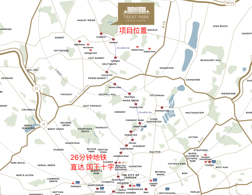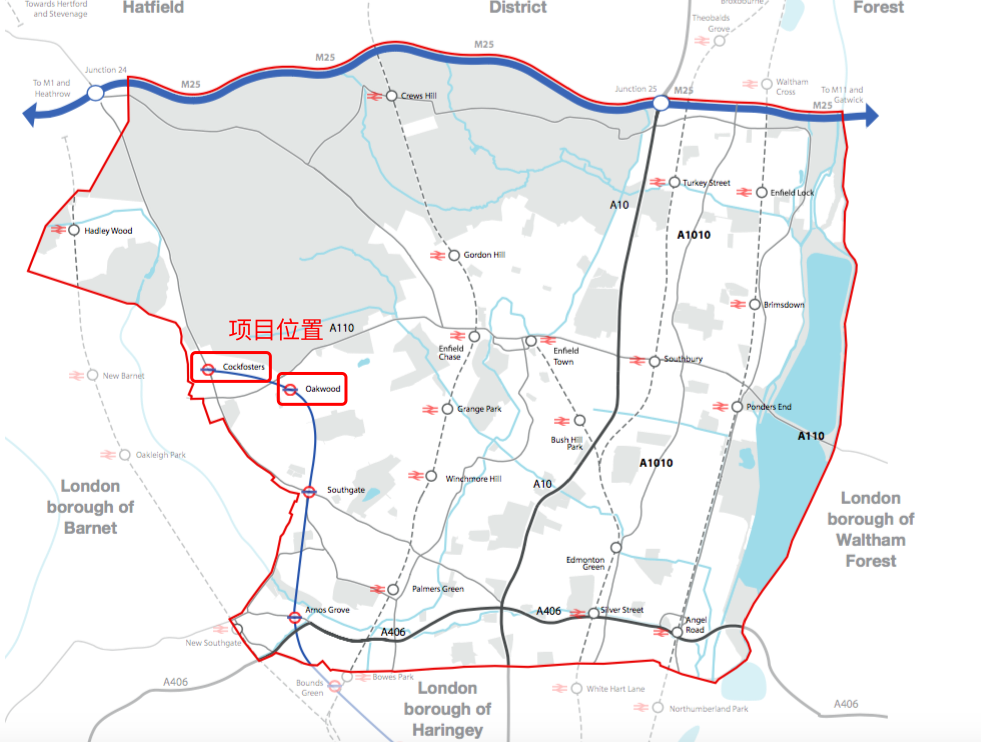 项目位于北伦敦Enfield,具体位置如下图所示,不仅在一个大公园内,又靠着两条地铁线。