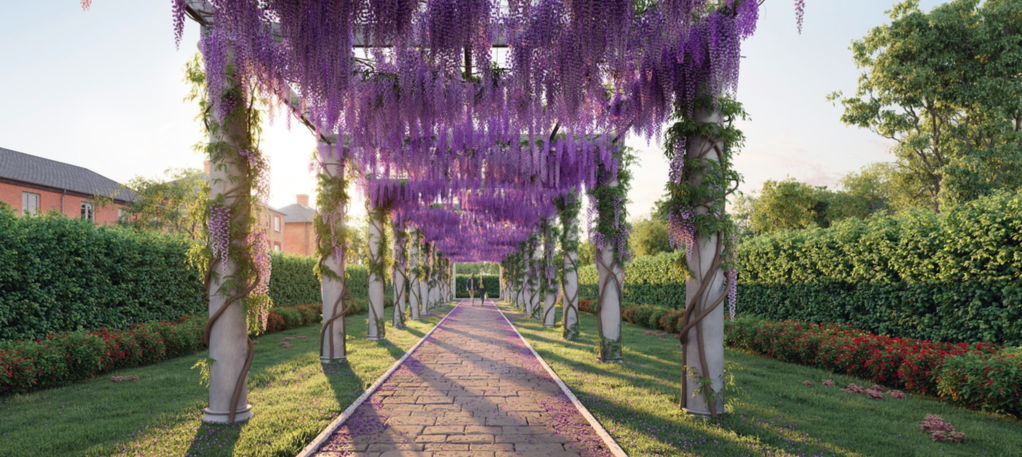 园林景观规划方面,包括紫藤大道和水仙花草坪。