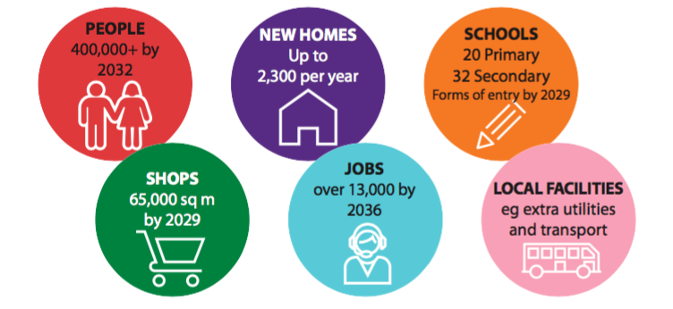 人口密度方面,预计到2032年,区域总人口将增加到400,000人。同时,还将新增13,000个本地就业岗位和每年2,300套新住房。