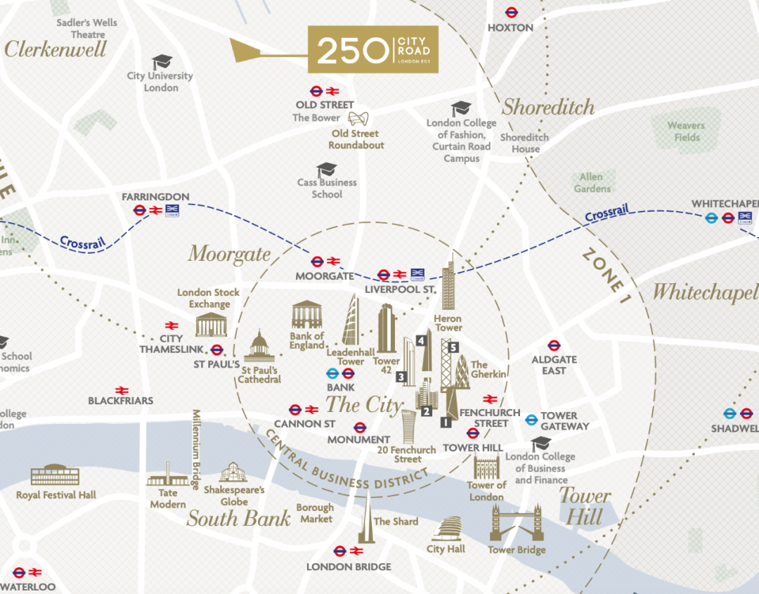 从项目出发,步行5分钟可达伦敦科技中心——硅环岛(Silicon Roundabout);最近的地铁站是Old Street,一站可达老金融城(City of London)。