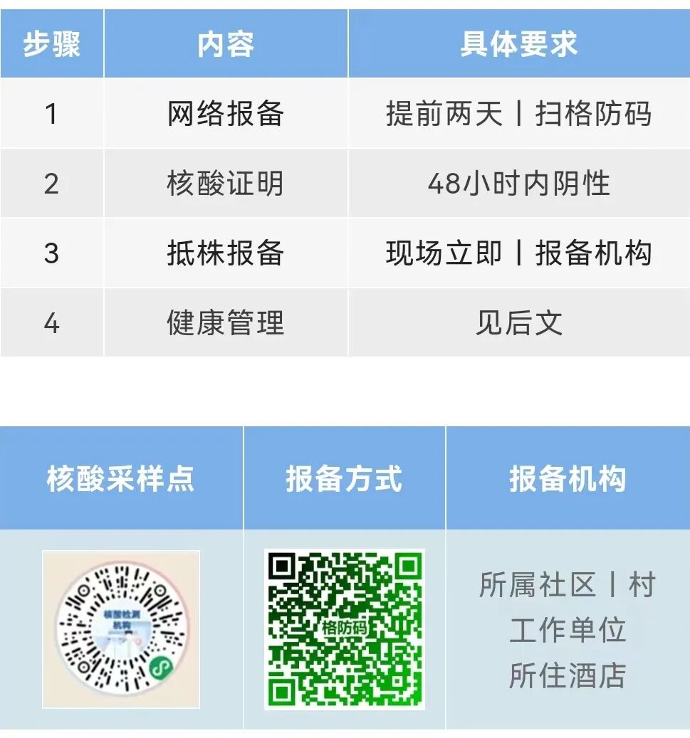 ① 所有省外来(返)株人员,以及省内有高中低风险区旅居史人员,特别是新疆、西藏、宁夏等地来(返)株的货车司机,要提前2天通过“格防码”或电话向所属社区(村)、工作单位(收发货企业)、所住酒店主动报备行程,配合落实相关防防疫要求。
