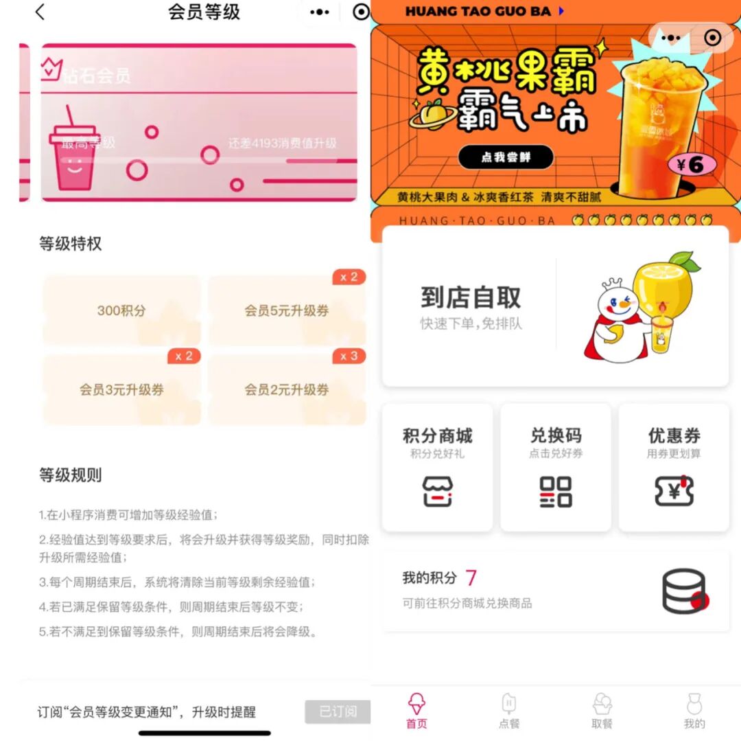小程序担当了蜜雪冰城数字化战略的主阵地,而更深一步的用户服务还需精细化运营。很多茶饮品牌做社群,会选择在消费者进店点餐时引导他们加入企业微信群。据悉,蜜雪冰城近期也在这方面展开了尝试。此外,还会用抽奖,发放满减券、折扣券、会员券等活动调动会员积极性。前段时间火遍全网的唱主题曲免单的活动,也是为了拉新促活、促进用户的自发传播。茶饮品牌的会员玩法还有很多,比如做会员卡包、会员任务,甚至付费会员。即消费者提前预付资金,然后用储值获得额外权益、积分、折扣。![]()