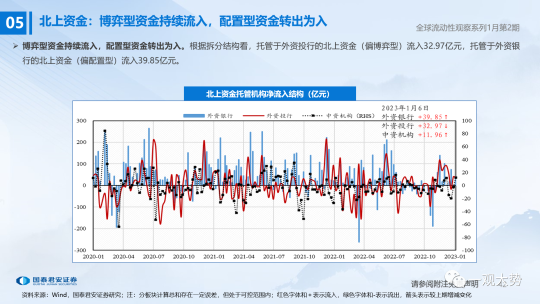 1)公募基金:新成立基金份额下降;从业绩表现上看,偏股型基金净值大部分上涨,中位数为1.83%。基金仓位普遍下调,基建地产类减仓幅度最大;2)私募基金:发行数量边际回落;3)银行理财子产品:基础资产中对权益资产的参与度上行,“破净”比例边际回落,赎回压力下降;4)两融资金:本期融资净买入46亿元,流入电新、有色金属、电子;5)北上资金:资金净流入200亿元,科技板块净流入最大。分资金类型来看,博弈型资金持续流入,配置型资金转出为入,二者均净流入TMT、消费、金融板块;6)ETF:ETF资金净流出114亿元,宽基综合净流出最多;7)资金需求:IPO发行规模边际回落,定增规模边际回落,解禁规模回升,产业资本净减持边际回落。