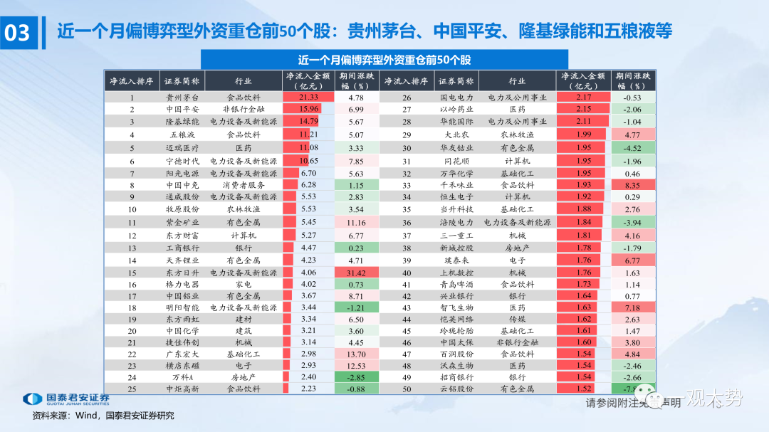 1)外资全面积极,大幅加仓。自11月以来海外流动性紧缩预期缓解以及国内经济重启预期之下,外资大幅加仓,近两周(2023.1.1-1.13)外资净流入640亿元,均值已接近2022年以来的峰值。如果根据北上资金托管机构划分不同资金配置特征,近两周托管于外资银行的北上资金(偏配置型)流入284亿元,托管于外资投行的北上资金(偏博弈型)流入141亿元。2)外资积极加仓食品饮料、非银与新能源。从近一个月北上投资者的配置结构看,北上资金集中增持食品饮料、非银行金融、电力设备及新能源。偏配置型增持食品饮料和非银行金融,偏博弈型增持食品饮料和新能源。3)近一个月外资重仓个股包括:宁德时代、中国平安、贵州茅台、五粮液、隆基绿能、东方财富、迈瑞医疗和比亚迪等。