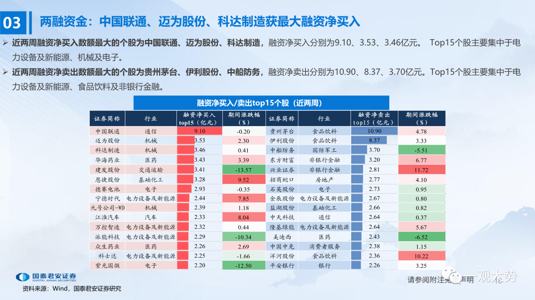 1)两融资金逐渐积极,近两周实现小幅净流入。融资净买入额看,近一个月两融资金大幅流出241.9亿元,但近两周转为小幅流入31.0亿元。2)两融减仓食品饮料、非银与新能源。从近一个月两融配置结构看,两融集中增持通信、房地产、国防军工和煤炭等行业,集中减持医药、电子、有色金属和食品饮料行业。3)近一个月融资净买入额最大的个股为迈为股份、中国联通、科德数控,融资净卖出额最大的个股为贵州茅台、伊利股份、纵横股份。