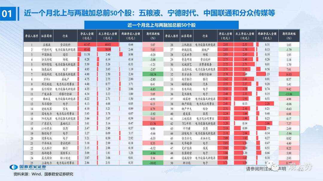 近一个月外资和两融资金均为净买入,且买入加总最高的个股为五粮液、宁德时代、中国联通、分众传媒和明阳智能等。