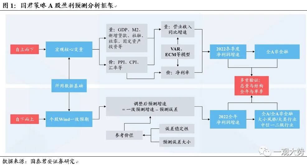 如何预测盈利增速?我们通过自上而下与自下而上两类视角预测盈利增速。自上而下视角重在对盈利节奏的判断。从宏观视角出发,自上而下利用计量模型对全A非金融板块的净利润增速进行预测,得到2023年全A非金融板块各季度净利润同比增速。同时考虑到金融板块自下而上预测的高准确度,汇总得到全A板块各季度净利润增速。而自下而上视角重在对盈利增速的判断。在个股Wind一致预期数据基础上,结合历史预测准确度进行误差调整,最终得到2023年归母净利润同比增速。两种预测方式各有所长,各有侧重。自上而下的预测能够进一步预测全年各季度的盈利节奏,而自下而上的预测不仅能够对总量层面的全A与全A非金融进行预测,更能进一步下沉至不同风格和行业的盈利预测,便于不同风格和行业间盈利特征变化的预测。