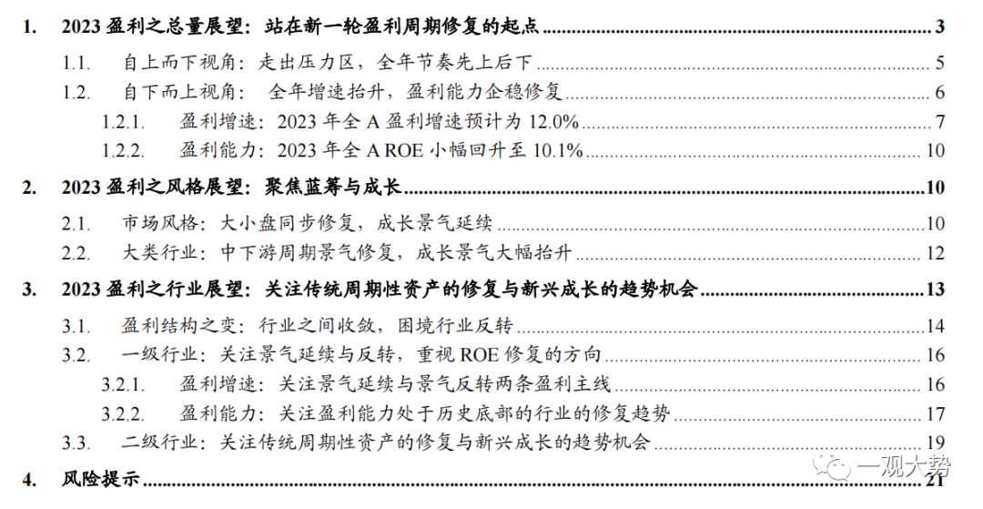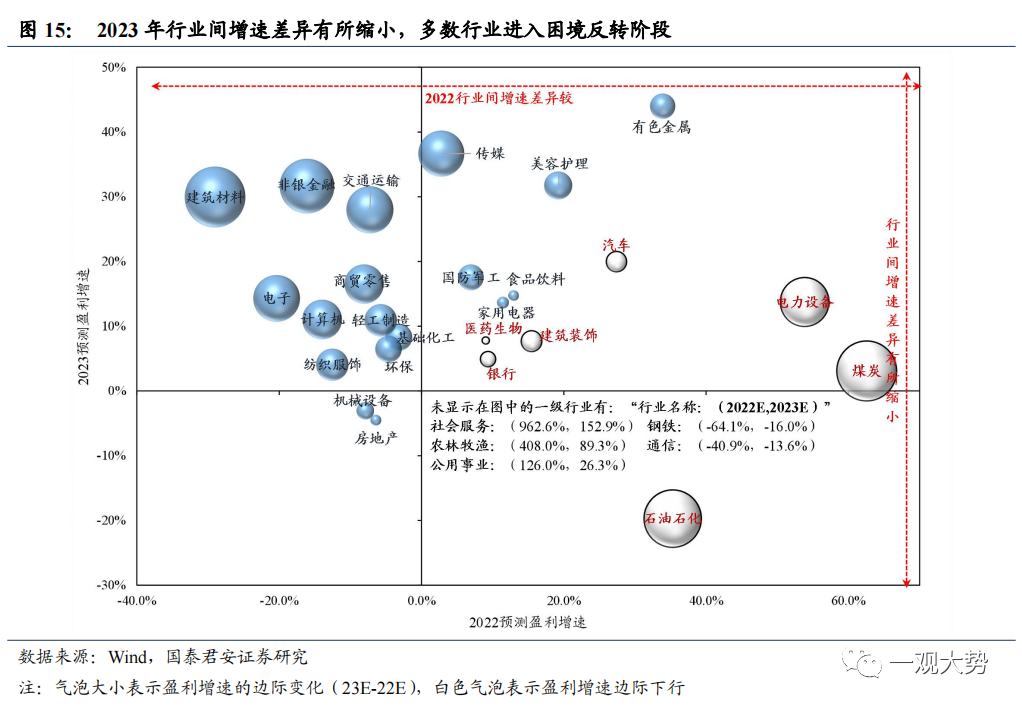 大类行业带来初步指引:2023年大类行业中明显的两个边际变化在于中下游周期的业绩反转与成长业绩的大幅抬升。