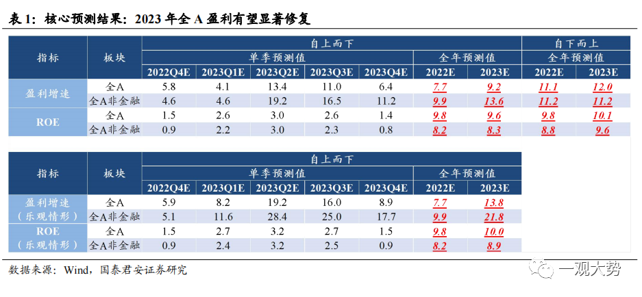 站在新一轮经济周期复苏的起点,2023年A股盈利有望显著修复。自上而下来看,进入2023年,随着稳经济的逐步发力,全年盈利增速大幅修复,Q2在低基数影响下将迎来全年盈利增速顶。基准情形下,2023年全A Q1-Q4单季度净利润增速分别为4.1%、13.4%、11.0%和6.4%,单季度ROE分别为2.6%、3.0%、2.6%和1.4%。而在乐观情形下,2023年全A Q1-Q4单季度净利润增速分别为8.2%、19.2%、16.0%和8.9%,单季度ROE分别为2.7%、3.2%、2.7%和1.5%。从自下而上预测增速来看,2023年全A和全A非金融盈利增速分别为12.0%和11.2%。