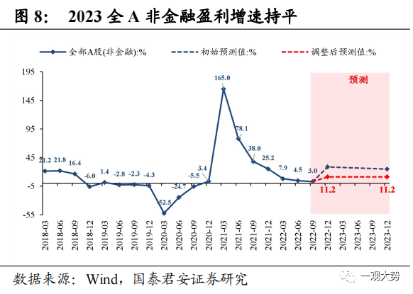 2023年走出压力区,全A盈利增速大幅抬升。从自上而下的盈利预测结果来看,2022年全A和全A非金融累计增速分别为7.7%和9.9%。而进入2023年,随着稳增长信号的逐步明确,疫情防控的逐步优化,地产的积极纾困,经济有望实现重启,预计全A盈利增速边际抬升,盈利能力企稳修复,其中在基准情形下,2023年全A