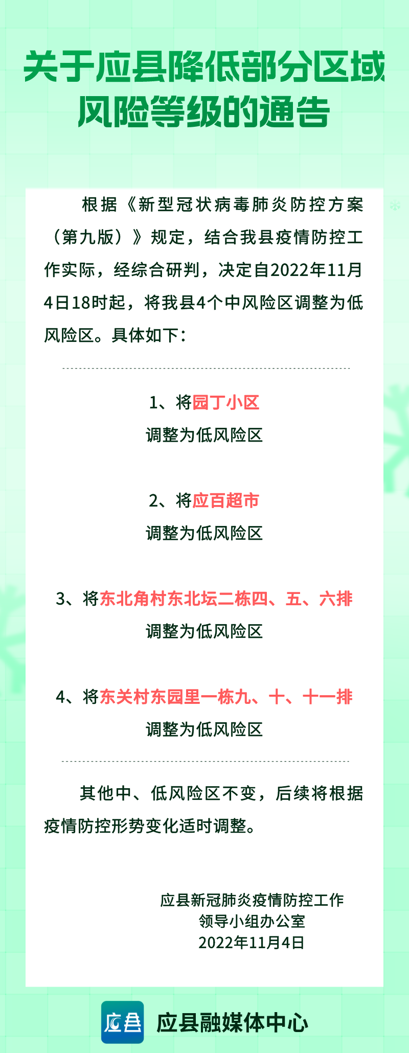 按照《新型冠状病毒肺炎防控方案(第九版)》有关规定,结合相关区域疫情动态情况和当前疫情防控工作实际,经专家组研判,即日起阳曲县东黄水镇西殿村、东黄水村,山西合成生物产业生态园,双阳路龙城晋府小区(1-4号楼除外)由中风险区调整为低风险区,阳曲县全域恢复常态化防控措施。