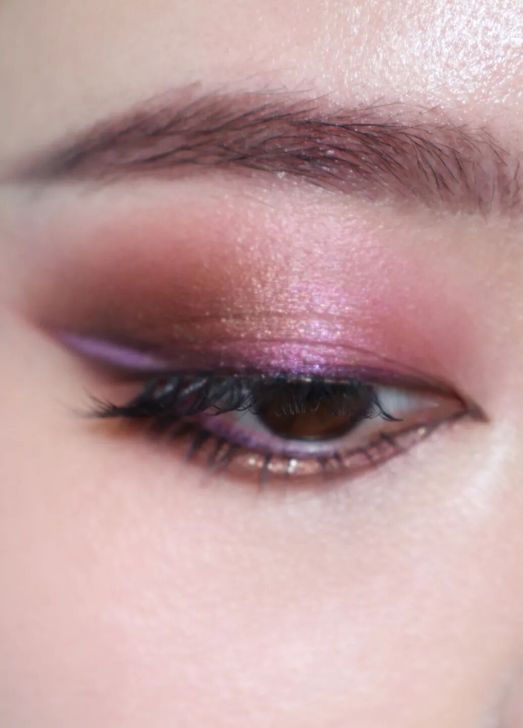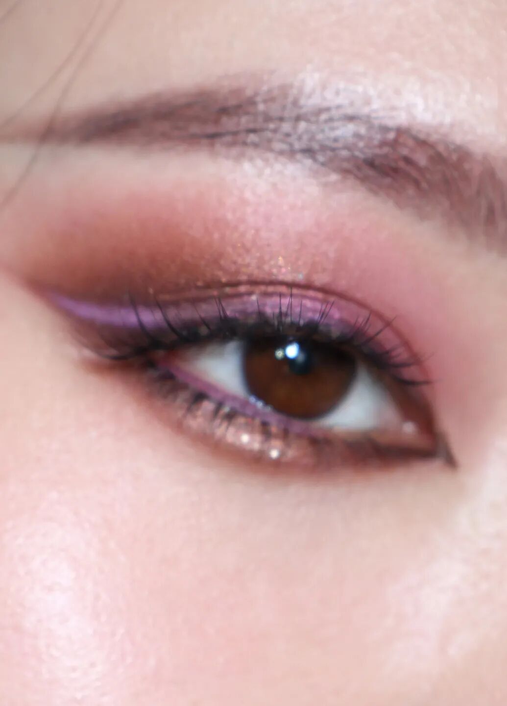 接着在眼皮中前块区域用类似草莓的紫色+粉色,来回叠加晕染。最后AKUMA用带细闪的粉色,提亮一下眼头和上眼睑~