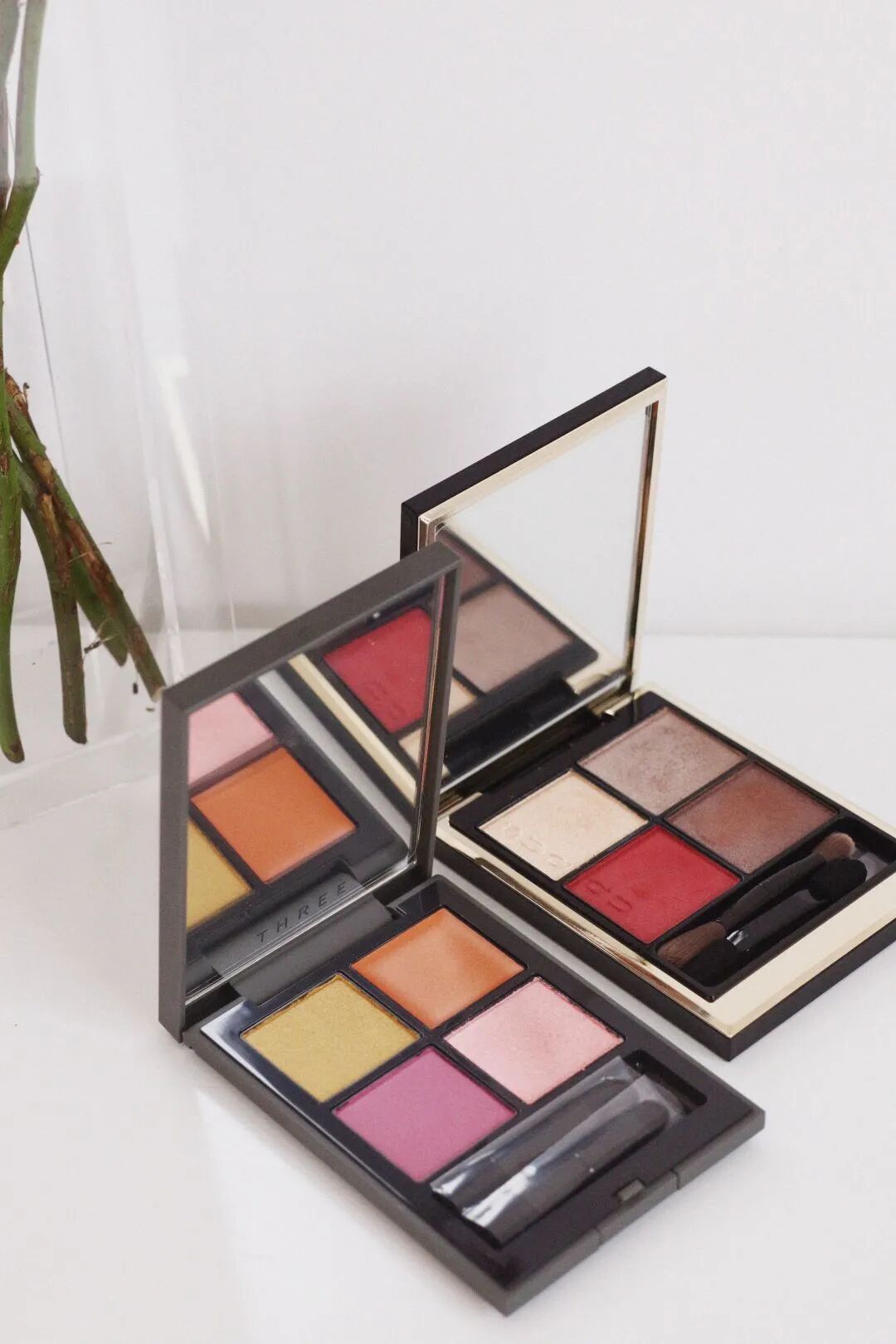 这次我选择两盘混搭上妆,分别用了THREE-11中的粉色、紫色,以及SUQQU-05中的大地色。