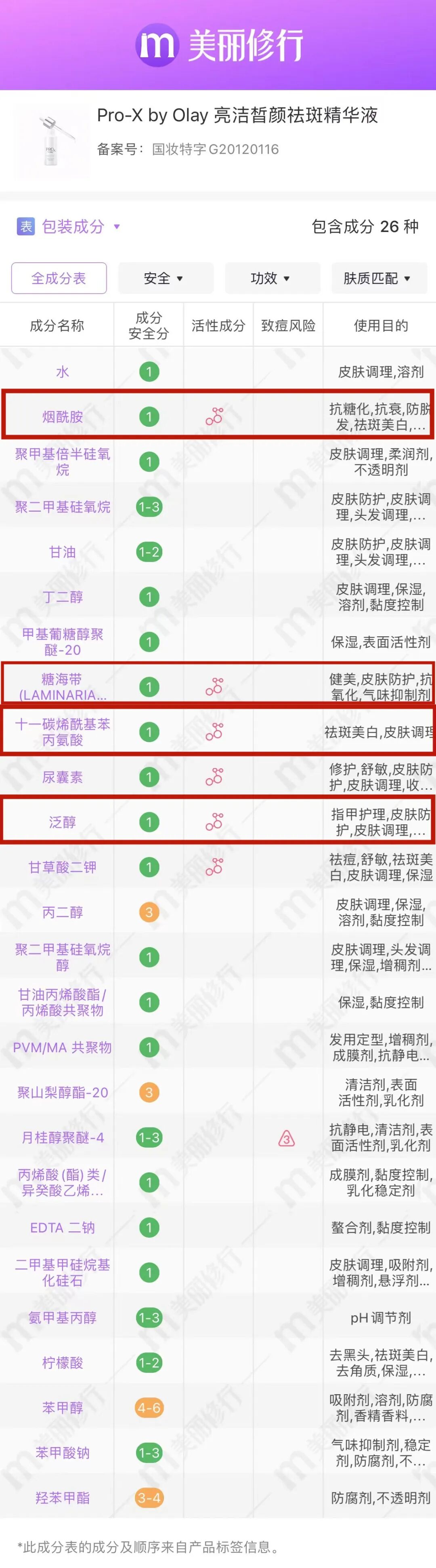 新旧两版的核心成分烟酰胺+十一碳烯酰基苯丙氨酸(酰本胺),简直就是OLAY(或者说宝洁集团)的招牌。它俩能深入肌肤赶走色素沉积与暗沉,美白淡斑的功效那可都是经过大噶的检验的。