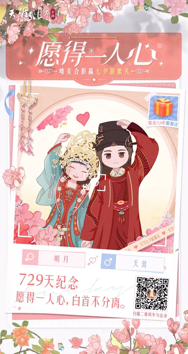 “愿得一人心”主题DIY合影活动开始啦!清甜国风合影,可爱的Q版形象可自由换装搭配游戏同款发型与服饰,更可提前试穿宋制婚服【天衣·合璧】噢!完成合影后,最终为相片签注彼此的定情诗句,见证一份真挚同心。参与活动即有机会赢取天衣礼券等丰富好礼,快来与TA一起定格甜蜜七夕!