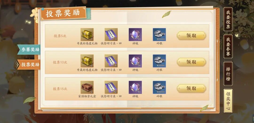 9月6日~9月13日每日登录游戏签到可获得投票道具“鹊羽”;此外,每日登录游戏时长分别达10分钟、30分钟时可通过在线奖励面板额外获得,在背包内使用即可获得投票积分。单角色当日最多可得3票,最多可投10票,活动期间最多可获得24票。