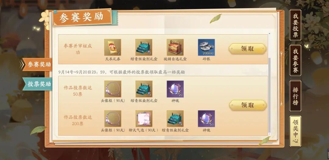 作品投票数达到200票:星河之约专属头像框(90天)、星河之约专属聊天气泡(90天)、绾青丝染剂礼盒*8、神魄*50