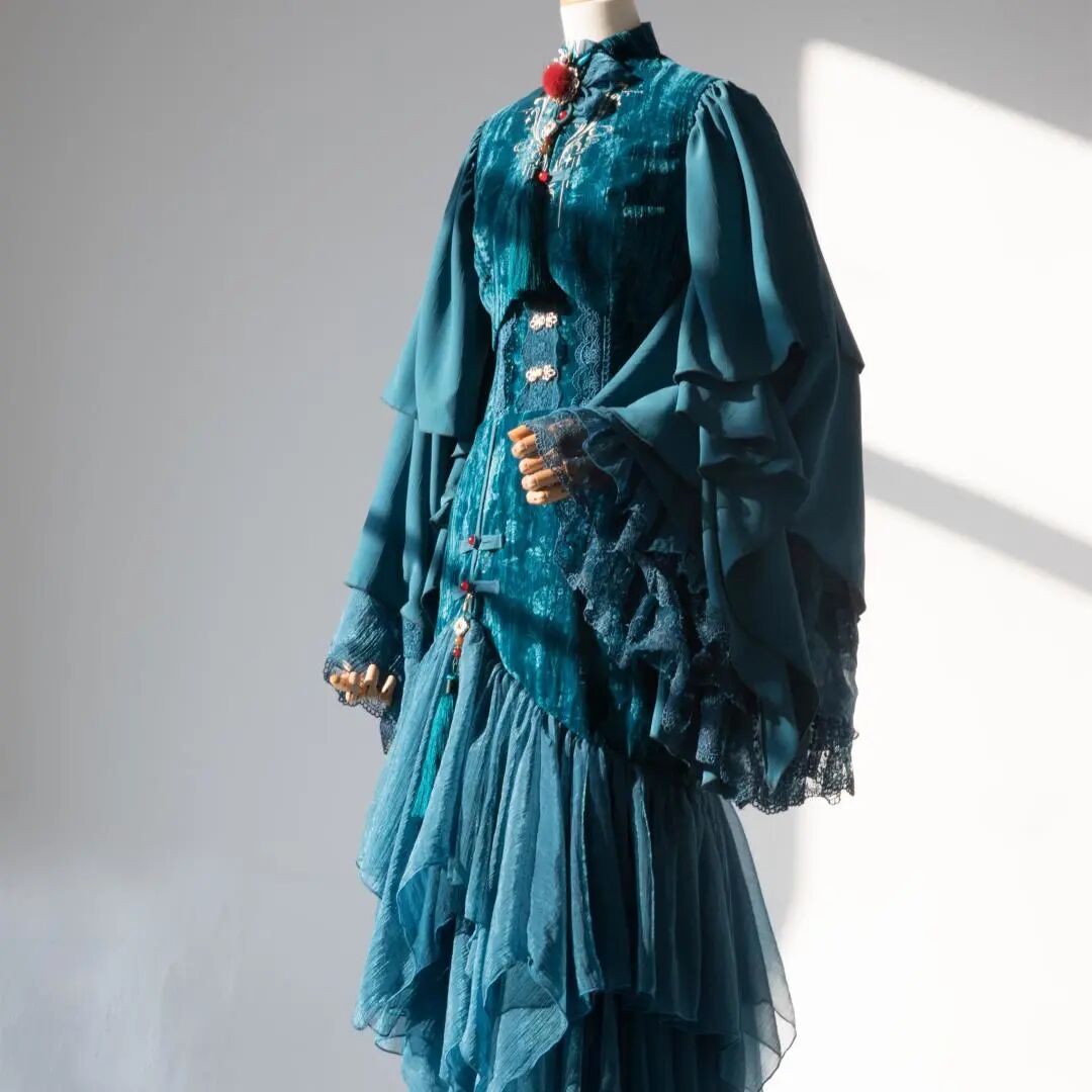 【心王·天仪】实体衍生国风Lolita,整体裙身沿用游戏外观的整体配色、成女鱼尾裙概念和少女的短裙作为延伸,打造出华美又大气的整体效果。