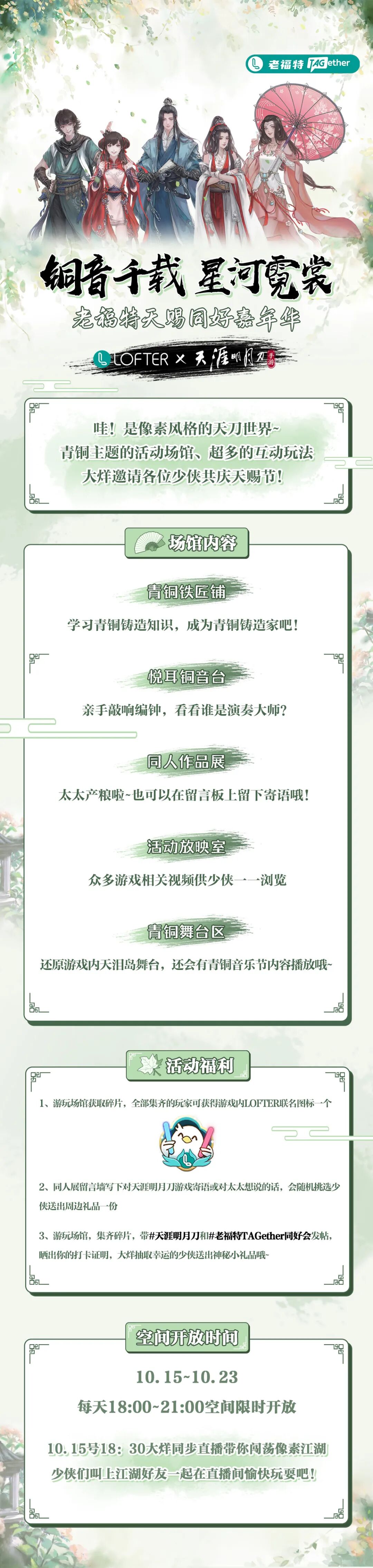 10月15日-10月23日每天18:00-21:00,少侠可以来到像素风的天泪岛继续回顾青铜编钟音乐会精彩节目,同时体验页面中的青铜小知识、体验编钟演奏等互动玩法。