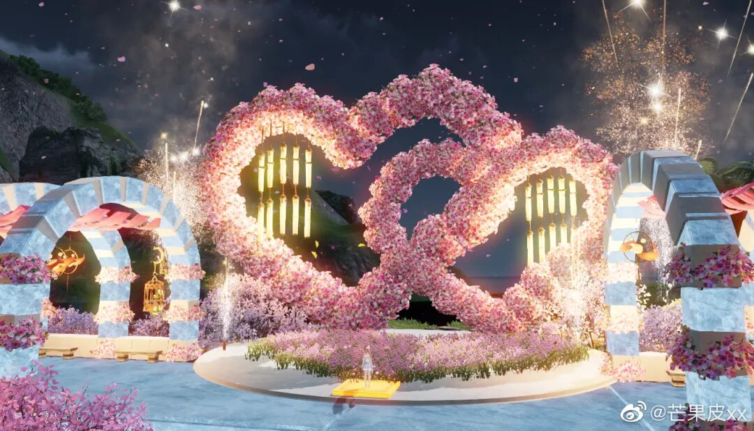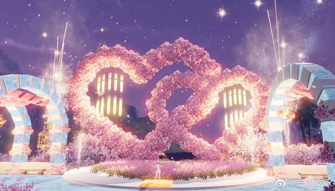 在江湖中,最长情的告白是陪你走过八荒,而在刀刀家园中最浪漫的事莫过于陪TA看一场不落幕的烟花~少侠将寓意浪漫的花朵组成心形花墙,在烟花下熠熠生辉,唯美至极~