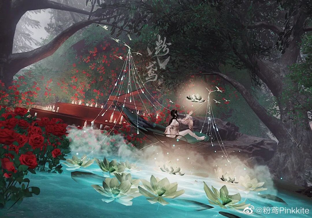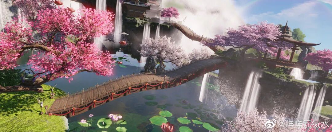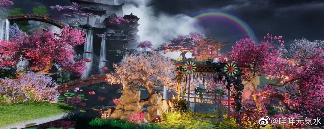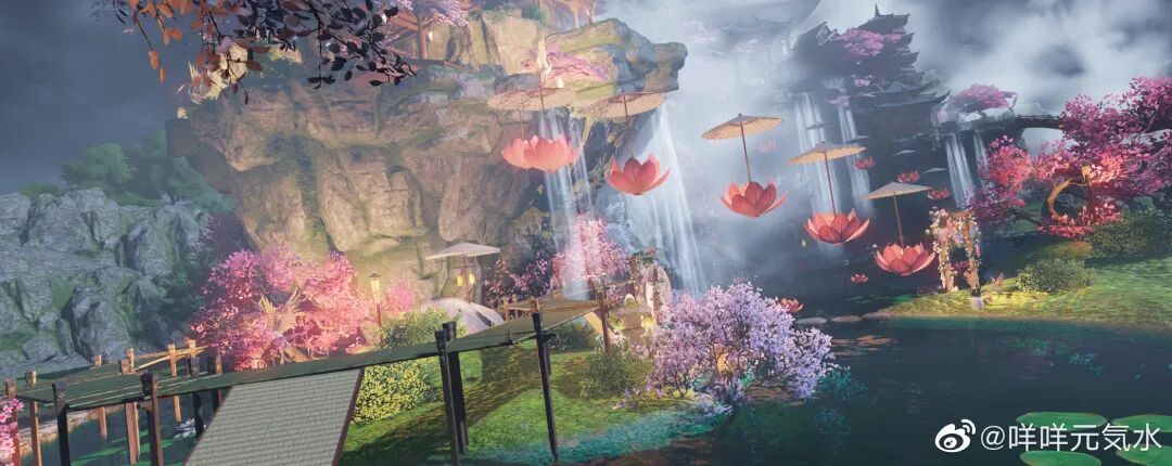廊腰缦回,檐牙高啄。空中飞瀑如同倾斜的银河一般,朵朵莲灯浮于空中,在那最高处还有一抹若隐若现的彩虹,衬得此处像一处世外仙境~