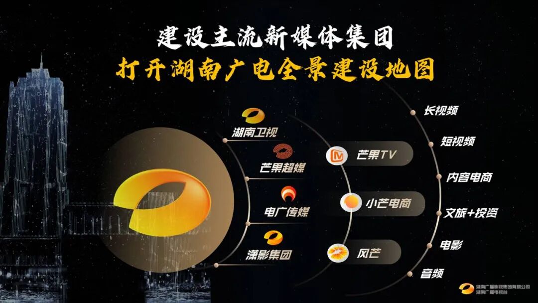 2020年,湖南广电提出了建设主流新媒体集团的战略构想,我们将其视为新型主流媒体的分形探索。湖南广电主流新媒体集团的全景建设地图,以做强主流宣传为最重要使命,以芒果超媒、电广传媒为自主可控的国有资本引擎,以芒果TV、小芒电商、风芒短视频等互联网平台为主阵地,与湖南卫视一起构筑形成了长视频、短视频、音频、电影、内容电商、文旅+投资等六大类主要业务的内容产业版图。