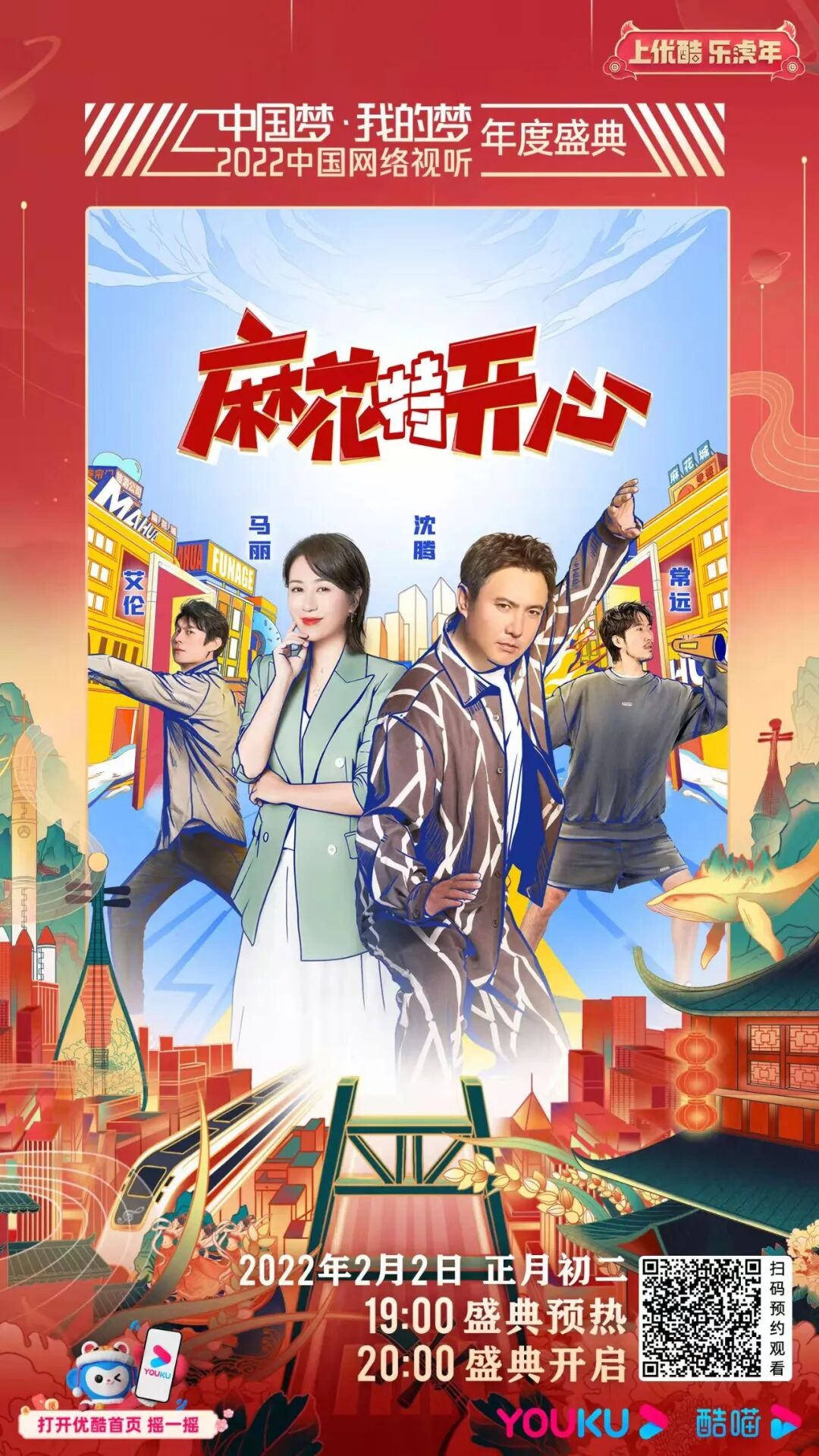 在“中国梦·我的梦——2022中国网络视听年度盛典”中,优酷秉持“小人物、真英雄、正能量、大情怀”的内容创作理念,将携《觉醒年代》《追光者》《这!就是街舞》《中国潮音》《追光吧》《麻花特开心》等优秀作品的系列衍生节目亮相,向观众展现积极向上、充满梦想的新时代精神风貌。2021年,由优酷联合出品的剧集《觉醒年代》在年轻人中引起巨大反响。在此次盛典中,剧中演员将以配乐朗诵的形式,演绎李大钊先生《青春》的节选片段。这段跨越百年时空的朗诵,将剥开时代变迁的外壳,触摸中国青年百年未变的赤子初心,鼓励当代青年以青春之我,创青春中国。歌曲《197653》是青年歌手肖顺尧观看纪录片《英雄儿女》后,有感于革命先辈浴血奋战,以血肉之躯保家卫国的精神,从而原创的一首说唱歌曲。“197653”是抗美援朝战场上牺牲烈士的人数,肖顺尧创作这首歌的初衷,不仅仅是悼念英雄先烈,更希望鼓励当代年轻人,莫忘来时路,吾辈当自强。歌曲《追光者》将带领观众走近时代“追光者”。优酷出品的《追光者》由国家广播电视总局、北京市广播电视局指导,是一部聚焦乡村振兴先进人物、优秀党员代表的网络纪录片。作品记录了他们以奋斗为底色,在一线燃烧青春岁月的动人故事。伴随着歌声,他们在科技研发、脱贫攻坚、全球抗疫、基础教育、生态保护等领域不懈奋斗、无私奉献的点点滴滴将重现观众面前。《国风街舞》紧扣“中国梦·我的梦”主题,希望通过年轻人喜爱的街舞形式,表达当代青年对生活和时代的热爱。节目中的舞者均来自优酷出品的综艺节目《这!就是街舞》。《这!就是街舞》已播出四季,该节目通过传统文化与潮流文化的碰撞,以及中外顶尖舞者的互鉴,为街舞文化注入阳刚、奋进、向上的时代价值,也将中国街舞文化传播到全世界。盛典中,《这!就是街舞》四季冠军将分别演绎高水准街舞,展现以舞会友、携手共进、共创美好生活的积极态度。由大张伟创作并原唱的《阳光彩虹小白马》在本次盛典中进行了中国风改编,民乐组合“乐玲珑”加盟,以民族乐器伴奏,融汇现代流行与民族曲风。此外,粤语金曲《漫步人生路》展现了广大香港同胞乐观向上、坚韧打拼的精神风貌。这两个节目分别衍生自优酷热播综艺《中国潮音》及《追光吧》。《中国潮音》将中国传统文化与流行音乐兼收并蓄,涵盖流行、电音、戏曲、民乐等多种音乐元素,表达当下年轻人的国潮态度和音乐自信。《追光吧》以新视角多维度地呈现中国男性特质,通过21位男性文艺工作者努力奋斗的“追光”之路,展现具有艺术担当、文化担当、与时代同频共振的竞演舞台。时值春节,仍有很多人坚守在工作岗位。他们当中,有卫国戍边的边防战士,有防疫抗疫一线人员,有即将迎战冬奥会的冰雪健儿,有兢兢业业的公交车司机,有奔走在大街小巷的快递小哥……这些为了“中国梦”不懈奋斗的普通人,是寒冷冬天慰藉你我的温暖亮色。盛典上,沈腾、马丽及优酷《麻花特开心》节目组全体成员将合唱歌曲《相亲相爱一家人》,给全国网友拜年,同时为即将开幕的北京冬奥会送上最火热的祝福,为中国及全世界的冰雪健儿喝彩!