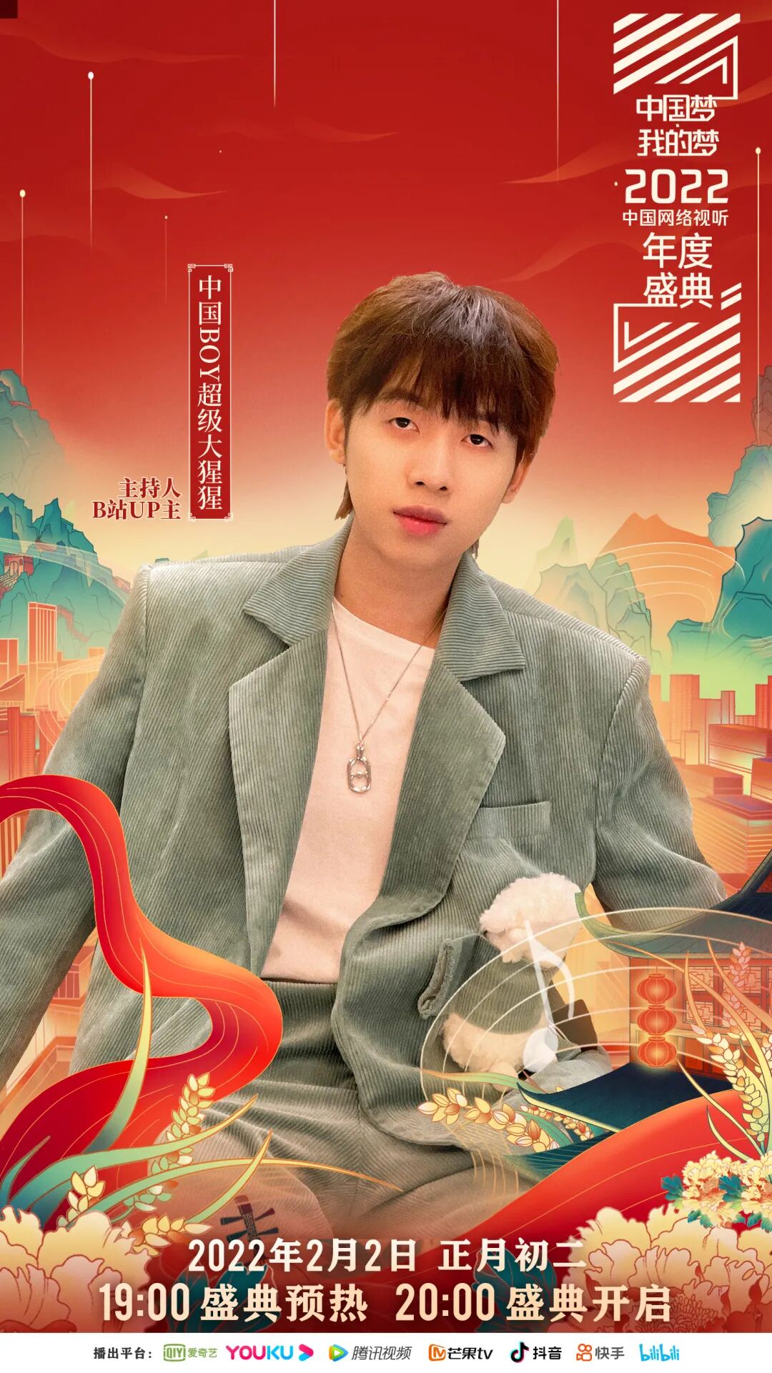 2022年是党的二十大召开之年,也是“中国梦”提出十周年。为动员激励网络视听行业奋发进取共筑中国梦,以优异成绩迎接党的二十大胜利召开,由国家广播电视总局网络视听节目管理司指导,中国电视艺术委员会主办,爱奇艺、优酷、腾讯、芒果TV、抖音、快手、bilibili(B站)、咪咕等8家重点网络视听平台联合承办的“中国梦·我的梦——2022中国网络视听年度盛典”(以下简称盛典),将于2月2日(大年初二)20:00上线众网络视听平台,敬请期待!