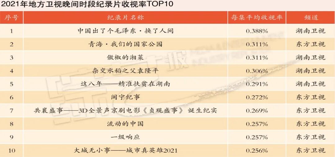 防疫、人文、自然、美食等题材纪录片热播,《一级响应》东方卫视晚间时段每集平均收视率0.257%,《青海·我们的国家公园》在30个卫视频道播出,单集最高收视率0.324%。