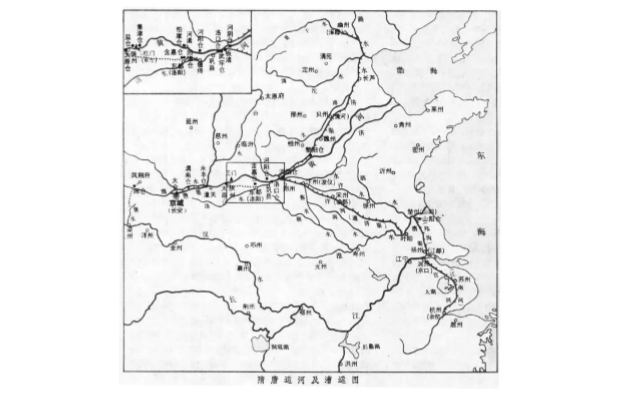 京杭大运河最初是在隋炀帝时期全线开通,路线是以洛阳为中心,由永济渠、通济渠、邗沟和江南运河连接而成,南通杭州,中经洛阳,北通涿郡 (今北京 ),如下图所示: