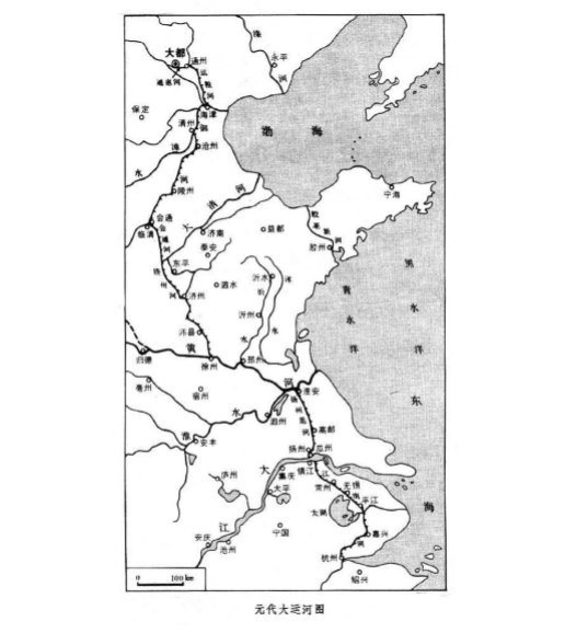 由于隋炀帝时期政治中心由长安东移到洛阳,所以大运河是以洛阳为中心,向东北和东南伸展。北宋都城在开封,原来的运河路线基本合理,能够满足漕运以及统治的需要,所以只做了部分的疏浚改造,并没有大规模更改河道的工程。而到了元代,由于都城北迁至大都,原来经由洛阳的漕运路线就显得相当不合理了。为了裁弯取直节省路线,元代对大运河进行了重大改道,将隋运河“涿郡 (今北京 ) —洛阳—杭州”的走向取直,把旧运河的中段东移至山东境内,也就是开通临清和济州之间原本没有的便捷通道。在临清和济州之间的河道工程,实行分期修建,先开济州河,再开会通河。元世祖至元十七年开挖济州河,南起济州,北到须城,引洸、汶、泗水为源,向北开河连接济水。“济州河者,新开以通漕运也。世祖至元十七年七月,耿参政、阿里尚书奏: ‘为姚演言开河事,令阿合马与耆旧臣集议,以钞万锭为佣直,仍给粮食。’世祖从之”。又在至元二十六年,自济州河向北经寿张、聊城至临清开会通河,接通卫河。因为会通河位于海河和淮河之间的分水脊上,所以在会通河上修建了插板门船闸 26座,并在济宁设水柜,南北分流,以调节航运用水,控制运河水位。这两段运河开通后,南方的粮船就可以由此取道卫河,直达通州。至此,运河才经过济州,元代之前运河不会经过济州。而明代自永乐帝一直定都北京,元代的运河路线完全适合新王朝的需要,所以基本保持旧貌,没有大的更改。图示如下: