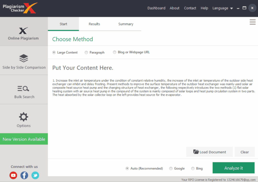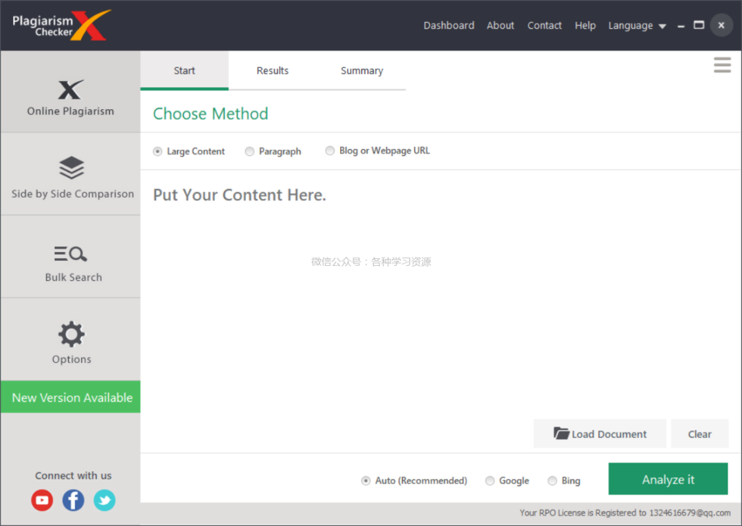 点击load document,选择需要查重的文件,点击analyze it 开始对比。完成后可以以Word、Excel(CSV)、PDF、HTML等格式保存查询结果。