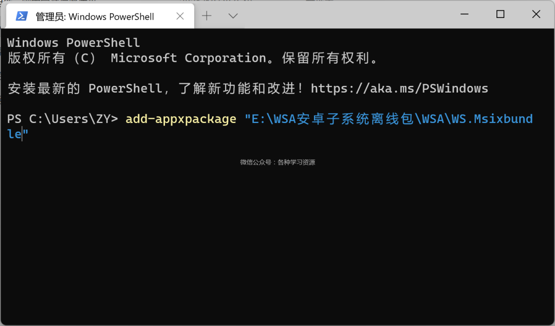输入命令 add-appxpackage " XXX "( XXX 为 WSA文件所在路径,不要忘记后缀 ),然后按下回车键,系统会自动安装文件到电脑上。
