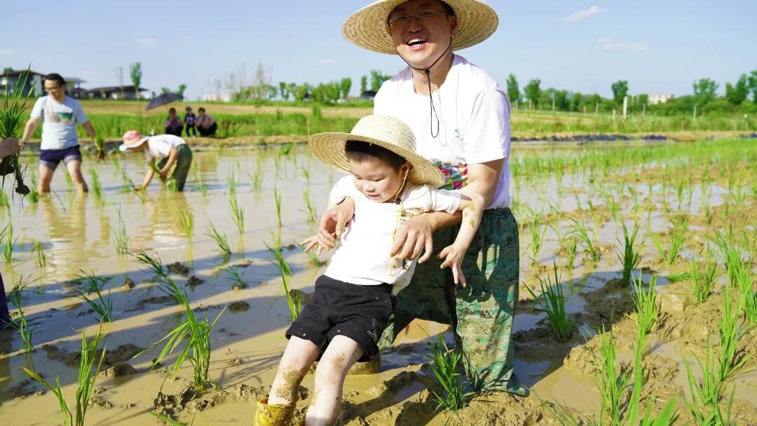 不管是大朋友还是小朋友,都全力参与到劳作中来,平日里光鲜亮丽的“都市丽人”和“萌娃”,下水田后竟也毫不含糊,一起奏响这曲夏日里的田园牧歌。