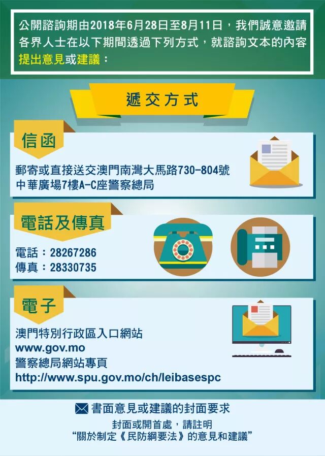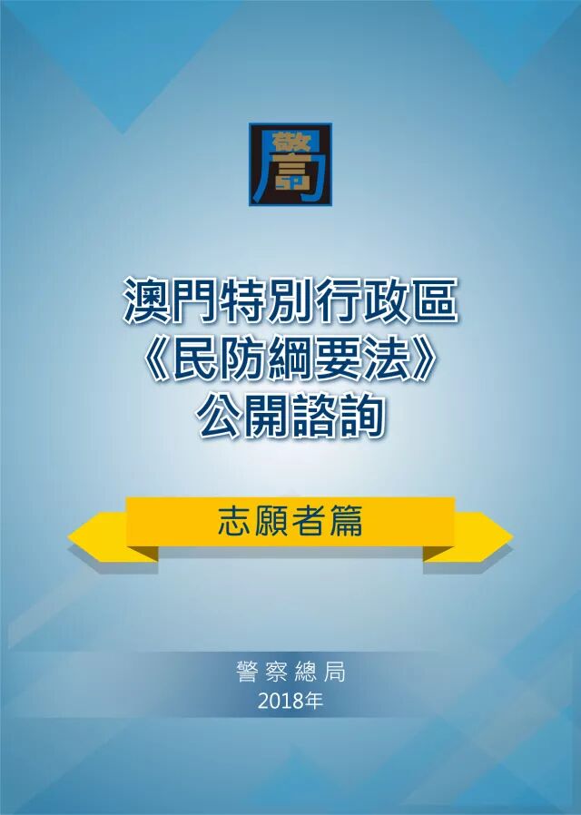 為回應社會發展形勢,革新民防事務的管理及運作、以及有效引導民間支援力量,澳門特別行政區政府現正就制定《民防綱要法》進行公開諮詢,諮詢期由2018年6月28日8月11日,有關諮詢文本可以到政府入口網站等連結到警察總局專題網頁下載或者到指定地點索取。歡迎各界人士透過專題網頁、出席諮詢會或者以電話、郵寄等方式發表意見。