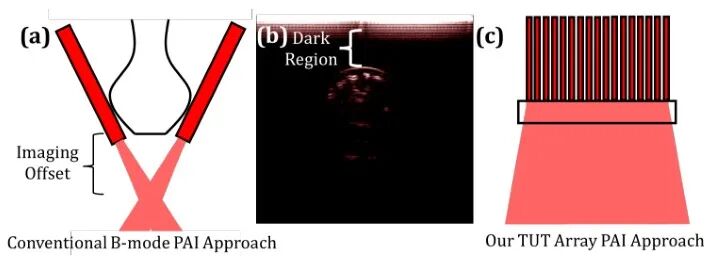 将荧光和PA成像集成到超声成像阵列平台中是实时多模成像最可行的方法之一,但是传统超声换能器的光学不透明性阻碍了超声换能器阵列与光学照明和检测光纤的同轴和紧凑集成。实时B型超声和超光(US and PA,USPA)成像设备是简单地将光纤束组装在传统的超声换能器探头周围(图 1)。在超声换能器表面以下1-2 cm深度,光学照明由于光纤束间的物理分离导致失效。USPA设备在大于1 cm的工作距离内运行,使用水或超声凝胶作为组织和探针表面之间的耦合介质,这限制了多模式成像设备的小型化和纵向体内成像能力,在耦合介质中形成任何气泡会导致出现伪影,增加超声衰减以及超声散射。