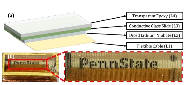 为了解决上述成像的限制,Sri-Rajasekhar Kothapall教授团队开发了一种基于透明铌酸锂(LN-)压电材料的一维 (1D) 线性TUT阵列。作者首先利用基于Krimboltz、Leedom和Mattaei (KLM)模型的仿真软件研究阵列元件的电阻抗、脉冲回波响应和相应带宽,并利用MATLAB超声工具箱(MATLAB Ultrasound Toolbox,MUST)模拟阵列的合成孔径在不同转向角下的光束轮廓。然后选择0.5 mm厚双面氧化铟锡(Indium Tin Oxide,ITO)涂层的LN压电材料以保证高光传输率和良好的机电耦合系数,并用6.5 MHz的中心频率以匹配常用的诊断超声设备。最后为避免出现栅瓣,作者选择0.3 mm的间距作为6.5 MHz线性阵列,该阵列共有64个元件,元件高度为5 mm。通过在500 µm LN晶圆内部切割400 µm产生64个元件。将1 mm厚的导电载玻片粘合到LN上。在载玻片的顶部放置了一层额外的透明环氧树脂背衬层,以进一步减少声学混响。并将各向异性导电膜(Anisotropic Conductive Film,ACF)粘合到阵列的边缘(图 2)。